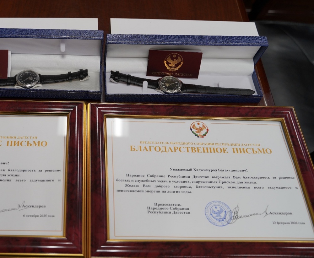 От имени Народного Собрания Республики Дагестан военнослужащим были вручены благодарственные письма за мужество, самоотверженность и добросовестное выполнение боевых и служебных задач в условиях, сопряжённых с риском для жизни, а также памятные часы в знак признания их заслуг.