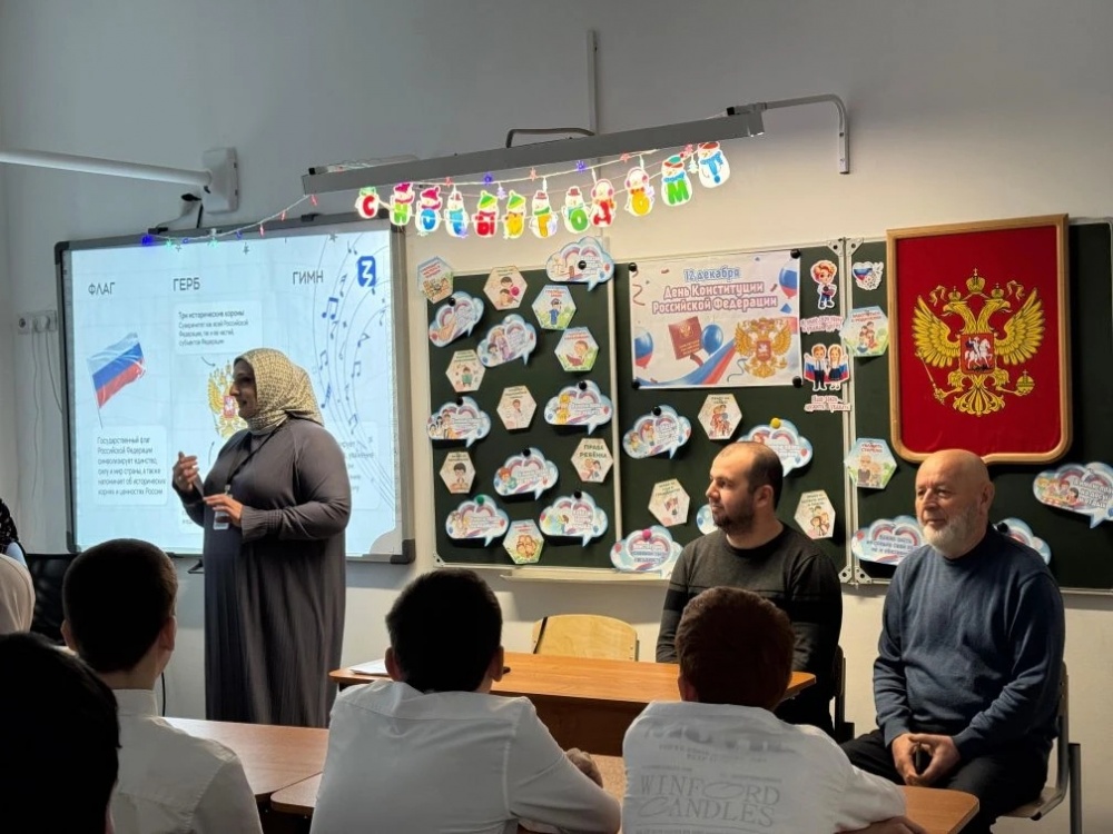 12 декабря в МКОУ "Советская СОШ" начальник ОДН и ЗП Администрации МО "Хасавюртовский район" Руслан Атаев и специалисты отдела провели лекцию от российского общества "Знание" на тему: "Символы российской государственности". В мероприятии принял участие также глава с. Советское – Наби Пахрудинов. Встреча была приурочена ко Дню Конституции РФ. Лекторы рассказали ребятам о важных символах страны: гербе, гимне и флаге. После учащиеся провели викторину по истории принятия и содержанию разделов и глав, главного Закона страны - Конституции РФ. Они показали хорошие знания и с легкостью отвечали на вопросы