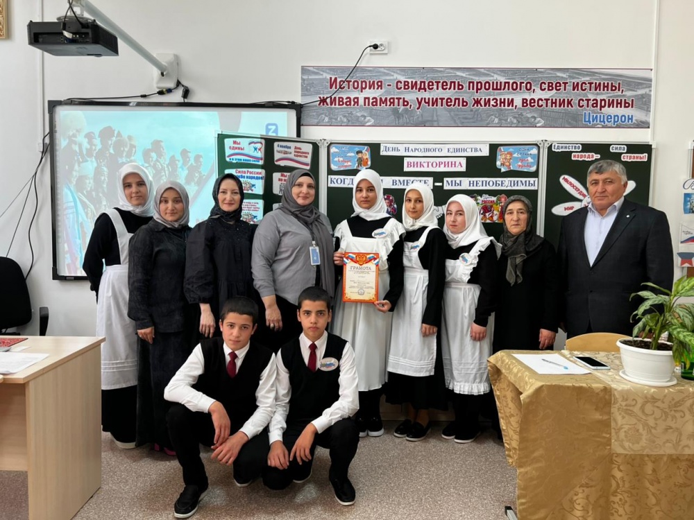 Накануне в рамках мероприятий, организованных дагестанским филиалом российского общества "Знание" ко дню народного единства в МКОУ "Ичичалинская СОШ" прошла викторина "Когда мы едины - мы непобедимы". Ребята разделилсь на 2 команды "Патриот" и "Непобедимые" и увлеченно отвечали на вопросы ведущей. Они показали отличные знания истории России периода смуты и воцарения династии Романовых. Судейская коллегия в составе главы с. Ичичали Магомедова С. М., директора школы Идрисовой Х.С., главного специалиста ОДН и ЗП Осиевой А.Р. и специалиста по работе с семьей ГКУ РД СРЦН в МО "Хасавюртовский район" Давлетбиевой К.З., присудила победу команде "Патриоты" и поблагодарила ребят за активное участие