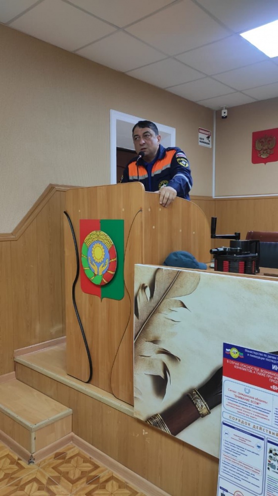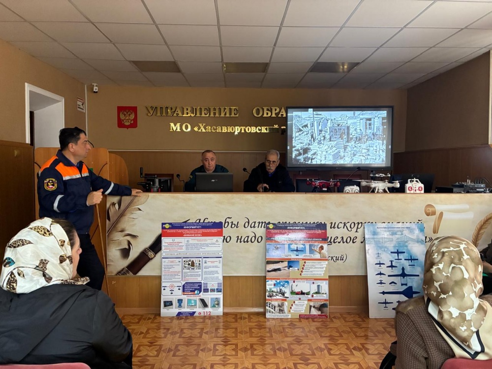 Сегодня, 07.11.2025 года, в актовом зале МКУ «Управление образования Хасавюртовского района» преподавателями ГБОУ РД «Учебно-методического центра по гражданской обороне и чрезвычайным ситуациям» совместно с специалистами МКУ «Управление по делам ГО и ЧС Хасавюртовского района» проведено занятие с учителями 1-4 классов, ведущих курс ОБЖ, воспитателями ДОУ, методистами ДОУ и руководителями групп занятий. Представил гостей и выступил перед слушателями начальник отдела ГО МКУ «УГОЧС Хасавюртовского района» Абдулнасир Тавбиев, который отметил о важности совершенствования проведения занятий по пожарной безопасности, обучения умениям и навыкам по гражданской обороне, защиты населения и территорий от чрезвычайных ситуаций природного и техногенного характера, по порядку действий при обнаружении беспилотного летательного аппарата, а также при ракетной атаке.